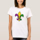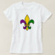 Design with seamless pattern with fleur-de-lys (lilly flowers) in the colours of New Orleans Mardi Gras; purple, golden and green design on white background