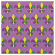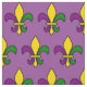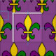 Fabric with seamless pattern with fleur-de-lys (lilly flowers) in the colours of New Orleans Mardi Gras; purple, golden and green design on purple background