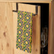 A kitchen towel with a seamless pattern with fleur-de-lys (lily flowers) in the colours of New Orleans Mardi Gras; purple, golden, and green design