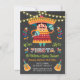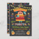 Super cute Mariachi Mexcian Fiesta Baby Shower invitations with a mariachi holding maracas and wearing a sombrero. Fun colourful accents, guitars, fonts and twinkle lights on a dark chalkboard background.