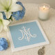 Perfect for Marian feast days, Catholic bridal showers, or spiritual gatherings, this elegant cocktail napkin features the traditional “Auspice Maria” monogram—a symbol of Our Lady’s loving protection. The design showcases the intertwined letters “A” and “M” with a cross, beautifully embossed-like look on a Marian blue field bordered in white. A devotional touch for any sacred celebration honouring the Blessed Virgin Mary.