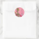 Outrageous Marie with feathers and a peacock in her hair. She is carrying a plate of tiny cupcakes. In the background is bubble gum pink with swirls. Fun for birthday parties, tea parties, etc. If you need help with personalising contact Greer at greerdesign@aol.com