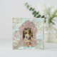 Marie Antoinette antique portrait in fancy pink frame. The background is soft pink roses, tassels and French script writing on lacy blue and white.