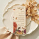 Elegant rustic boho wedding menu featuring marigold flowers, chrysanthemum, and dahlia floral autumn with a vintage border. Warm orange, burgundy, golden tones, and fall leaves combine with beige for a botanical watercolor design. Romantic bohemian style perfect for spring, summer, or fall receptions with terracotta and burnt orange accents.