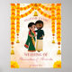 Marigold garlands bells with South Indian Tamil Telugu wedding personalised wedding welcome sign.