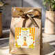 Marigold garlands cute Indian girl Haldi personalised name custom favour stickers. Yellow and orange marigolds with bells, yellow mandala background.