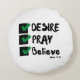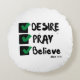 This round pillow design is based on the Mark 11:24 bible scripture displaying the word "Desire, Pray, Believe" a paint brush stlye print font with black letters and green and black checklist plus bible citation in this KJV faith based quote theme. This pillow is made with high quality fabric our pillows are soft and wrinkle-free the cover is machine washable.