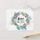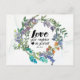 Inspirational scripture postcard depicts a pretty colourful watercolor wreath with wild meadow flowers in shades of purple, blue and orange and greenery. It features Bible Verse Mark 12:31, "Love your neighbour as yourself."