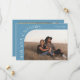 Modern and stylish save the date card featuring a text that says "mark your calendars" along the curved frame photo. One photo in the front and one on the back. The background is denim blue.