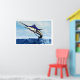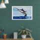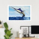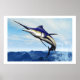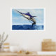 A sleek blue marlin bursts from the ocean surface in a grand leap.