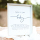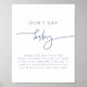This "don't say" sign features a bold bohemian script font and modern minimalist design with a boy dusty blue and white colour combination. Use these templates to edit all wording, font, font colour, and the background colour to match your event style.