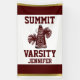 Cheerleader themed vertical banner done in white, with a gold tone and maroon stripe, on the top and bottom. Maroon graphic artwork of a megaphone and pom poms, decorate the middle of the banner, with custom maroon text ready to personalise. Options for indoor banners or outdoor banners with grommets is available.
