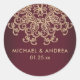 A beautiful MAROON BURGANDY BORDEAUX HUED and gold party favour thank you labels and stickers with an exotic Indian inspired ornamental sari like medallion pattern with a floral and lotus design. This elegant and beautiful modern Indian style sticker is perfect for any formal or special occasion including weddings, engagement, birthday and anniversary parties or any elegant black tie affair with an east asian indonesian moroccan arabian nights or aladdin theme. © Chrissy H. Studios, LLC. All Rights Reserved.