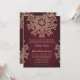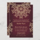A beautiful maroon burgandy and gold wedding invitation with an exotic Indian inspired ornamental sari MEDALLION pattern WITH A FLORAL AND LOTUS SUNBURST DESIGN. This elegant and beautiful modern Indian style wedding invite is perfect for any formal occasion WITH AN EAST ASIAN INDONESIAN MOROCCAN ALADDIN OR ARABIAN NIGHTS THEME. Designed by Chrissy H. Studios, LLC. All Rights Reserved.