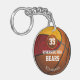 This personalised girls' basketball keychain features her maroon and gold school colours on two panels of a simple basketball graphic with easily customisable player name and jersey number plus school name and mascot name - the coloured panels are blended with a digitally created texture for an artsy appearance - reverse side text reads, "Yeah, I play like a girl! Try to keep up!" in maroon and gold text overlying coordinating maroon and gold colorblocks - by katz_d_zynes