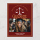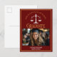 This chic maroon and gold custom law school graduation announcement postcard features classy typography for a class of 2024 graduate above your student photo. Customise with your graduating year under the white scales of justice and photograph for a great personalised lawyer or attorney postcard.