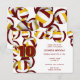 This volleyball themed party invitation features clustered maroon, gold and white volleyballs at the left and top edges on the front and a single cluster covering the back of the invitation - customise the party details in coordinating colours on a white background - by katz_d_zynes