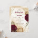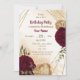 Beautiful birthday party invitations featuring maroon and beige gold flowers with green leaves .