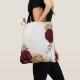 Beautiful tote bag featuring maroon and beige gold flowers with green leaves .