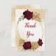 Beautiful wedding thank you card featuring maroon and beige gold flowers with green leaves .