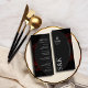 Beautiful Script: The front of the menu features a curated flow of information:
