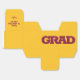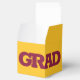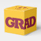 GRAD in bold maroon lettering wraps around the front of these yellow gold 2" square graduation party favour boxes with your name and thank you message on the top.