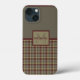 Professional looking, maroon, tan, moss green and grey plaid phone case has a tan square trimmed in maroon with your name and initial in the centre. The top portion of the phone is a coordinating moss green.