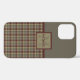 Professional looking, maroon, tan, moss green and grey plaid phone case has a tan square trimmed in maroon with your name and initial in the centre. The top portion of the phone is a coordinating moss green.