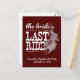 Yee haw!!! It's time to celebrate one last time before this cowgirl gets hitched! It's the bride's last ride before she settles down, also known as a bachelorette or hen party. Design features a cowgirl racing on her horse with distressed western and fat script text and stars. Perfect for a western or country themed eventShown in Aggie maroon. Also available in a combination of pinks, state flag blue and red, and burnt orange. Matching products available.