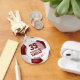 This girls' soccer keychain with maroon and white school colours features a classic soccer ball with maroon and white panels - customise the player's name and jersey number plus her school and team mascot name - by katz_d_zynes
