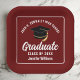 This modern maroon and white custom graduation party paper plate features classy typography of your high school or college name for the class of 2025. Customise with your graduating year under the chic handwritten script and black grad cap for great personalised graduate decor.
