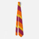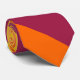 This bold tie contains maroon, orange, and yellow-gold diagonal stripes.