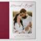 Celebrate your first Christmas as a married couple with our Married and Bright tri-fold holiday photo card! The front of the card features "Married & Bright" in a cranberry hand-lettered modern script. Your wedding photo is displayed with a white rough edge border. Personalise the front of the card by adding a custom greeting with your names shown below. The inside of the card features two photos with space for a custom message in the middle. The outside inner flap features a fourth vertical photo. The outside middle of the card displays a cranberry background with a white sparkling star pattern.