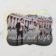 This modern and simple holiday/christmas wedding announcement card features the word 'Married and Bright' in a trendy calligraphy script overlaying a full bleed photo. The back of the card has a gold background with white snow dots pattern.