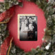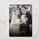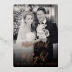 This modern and simple real foil pressed holiday/christmas wedding announcement card features the word 'Married and Bright' in a trendy calligraphy script overlaying a full bleed photo. The back of the card has a faux silver / platinum glitter image (with a colour filter applied) background with white snow dots pattern.