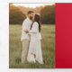 Celebrate your first Christmas as a married couple with our Married and Bright tri-fold holiday photo card! The front of the card features "Married & Bright" in a red hand-lettered modern script. Your wedding photo is displayed with a white rough edge border. Personalise the front of the card by adding a custom greeting with your names shown below. The inside of the card features two photos with space for a custom message in the middle. The outside flap features a fourth vertical photo. The outside middle of the card displays a red background with a white sparkling star pattern.