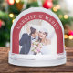 A keepsake red snow globe to celebrate your first Christmas as newlyweds featuring two wedding photos in arch frames and "Married & Merry" in elegant white serif typography.