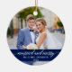 Married and Merry Elegant Calligraphy Script Wedding Photo Blue Ornament with Snowflakes back.