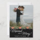 Christmas holiday photo card for newlyweds features your favourite wedding photo with "Married and Merry! in white script on top of a black background. Personalise with your names and the year beneath. On the reverse side is a sentiment for your friends and family who shared your wedding with you. It is surrounded by a lovely pine boughs, pinecones and poinsettias frame.