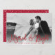 Chic holiday photo card for newlyweds features your favourite horizontal or landscape orientated wedding photo with "married and bright" overlaid in festive cranberry red script lettering. Personalise with your names and the year beneath. Cards reverse to a snow and stars pattern in white on matching cranberry red.