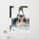 Elegant holiday photo cards for newlyweds feature a favourite vertical or portrait orientated wedding photo with "married & bright" overlaid in festive green calligraphy script adorned with snowflakes. Personalise with your names or custom greeting beneath. Perfect as a combination Christmas card and thank you card at your first married Christmas, you can add four additional photos to the back, along with a custom pre-printed message of thanks to your guests.