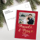 This Married and Merry Newlyweds First Christmas Photo Foil Holiday Postcard features a photo of the newlyweds and Gold Foil for the Elegant Script Married and Merry and the border around the photo. This custom photo greeting post card in red is the perfect way to celebrate a newlywed couple's first Christmas, with its clean and modern font and classic holiday colours, couple's photo, as well as a personalised message on the back. The playful "Married and Merry" message on this postcard is a thoughtful and sentimental way to celebrate their first holiday season together.