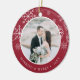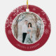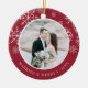 Festive photo Christmas ornament for newlyweds features a favourite wedding photo on each side, framed by white snowflakes on vibrant cranberry red. Personalise with a custom caption on each side; shown with "Married & Merry" on front and your names on the back.