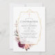 Boho burgundy red and blush pink floral first holy communion invitation featuring peonies and roses with gold geometric frame customisable to your event specifics.
