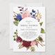 A lovely rustic bridal shower invitation featuring text in a white circle surrounded by a watercolor floral bouquet in shades of marsala or burgundy, navy blue, and pink. The reverse side is a matching shade of marsala.