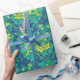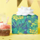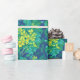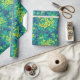 Wrapping paper featuring colourful floral pattern, beautiful marsh marigold flower, huge burdock leaf of and dandelion buds. Colour palette: golden and lemon yellow, turquoise, teal, green and blue colours.