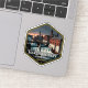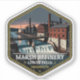 A hexagonal vintage travel badge inspired by the Marsh Refinery at the Lower Falls of the Manuxet River in Innsmouth, depicting early industrial architecture and controlled water power in a classic retro style.