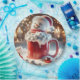 A cheerful marshmallow snowman sits in a red mug filled with hot cocoa, spread around with mini marshmallows and Christmas ornaments