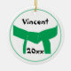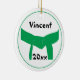 The unique Martial Arts Green Belt Round Ornament can be printed with the name of your martial artist athlete and current year to commemorate a belt rank promotion test in taekwondo, karate, judo, ju jitsu or kung fu. This custom martial arts sports ornament features a digitally enhanced photograph of a greenbelt tied in a knot with a white background.
