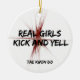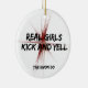 Customise the cute Martial Arts Tae Kwon Do Girls Kick and Yell Round Christmas Ornament with the name of your martial artist gal and current year. Create a custom girly keepsake gift to commemorate a belt rank promotion test or exam, birthday or holiday for your daughter, sister, wife, mum , aunt or girlfriend. This one of a kind martial arts sports xmas ornament features an abstract black and red fractal background with the words Real Girls Kick and Yell in black.